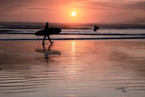 British-Columbia-Road-trip-to-Tofino-Vancouver-Island-Pacific-rim-coast-surfers-with-board-during-sunset-at-the-beach-Canada-Vancouver-Island-DP